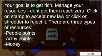Controls: Mouse. Click the stamp to approve a law, or click the shredder to reject it. Keep an eye on your resources and try to become a wealthy mayor.